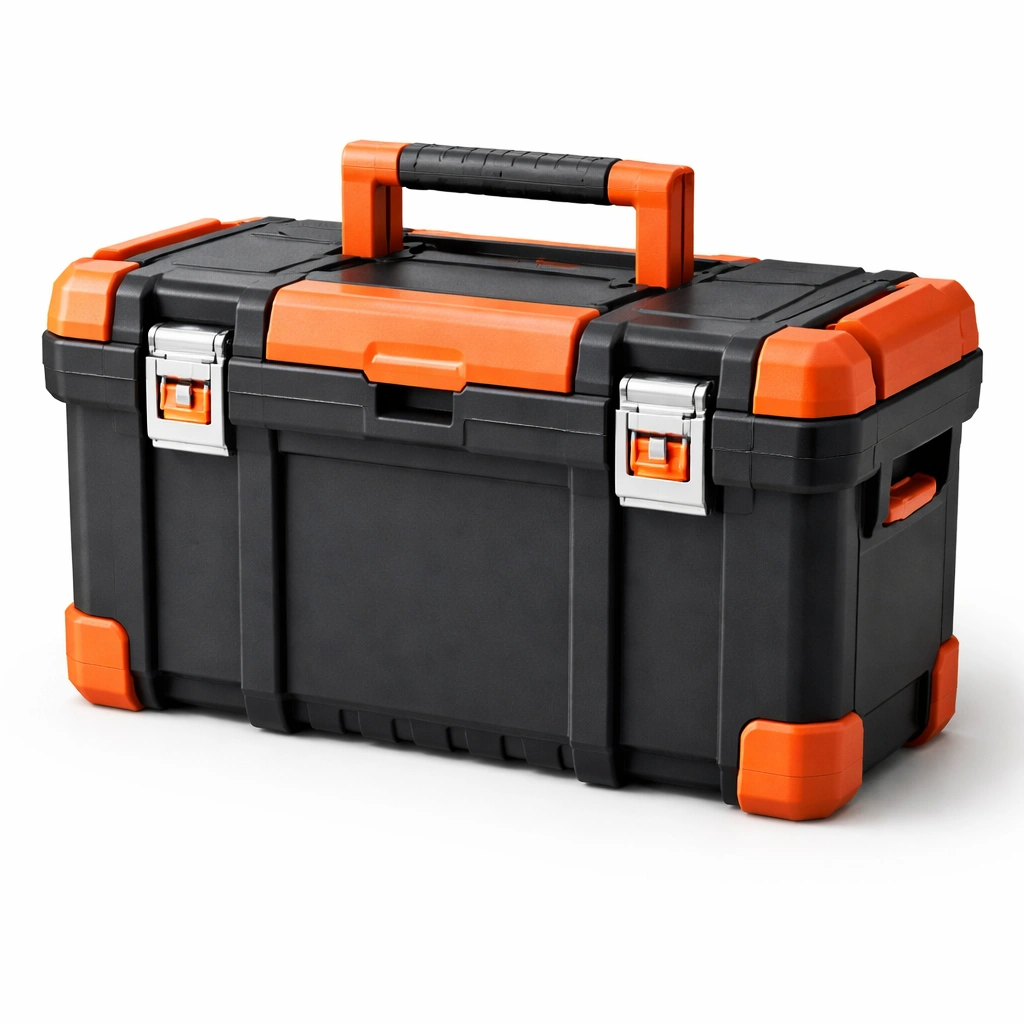 Cassetta degli attrezzi in plastica nera e arancione con serrature in metallo 52x30x28 cm