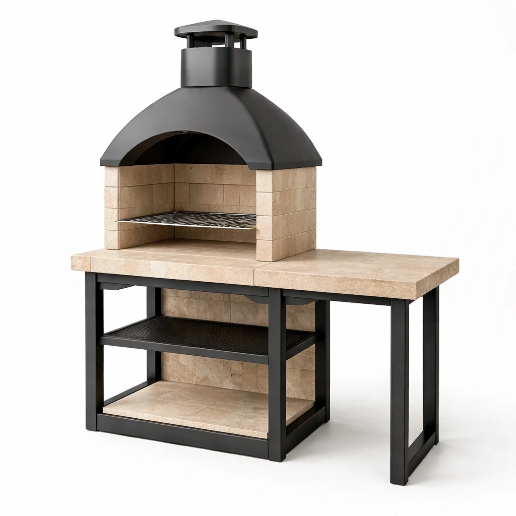 Il forno a legna include una griglia interna in acciaio inossidabile e un ripiano laterale.
