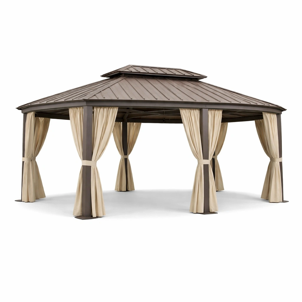 Gazebo esagonale con struttura in alluminio e tetto in pannelli di acciaio. Le tende sono realizzate in poliestere resistente.
